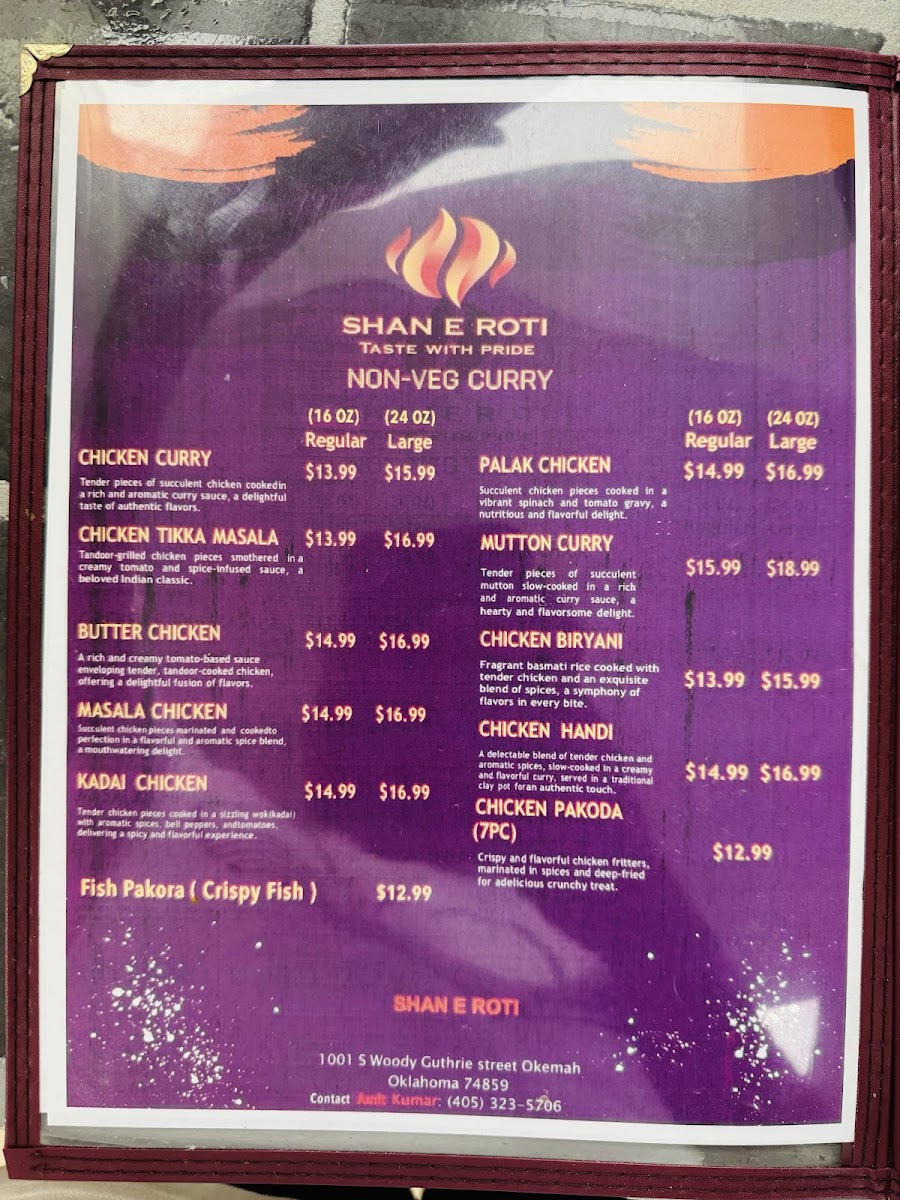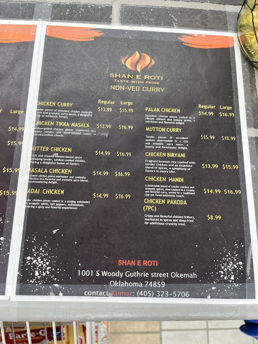 Shan - E - Roti (Oklahoma) truck stop Menu
